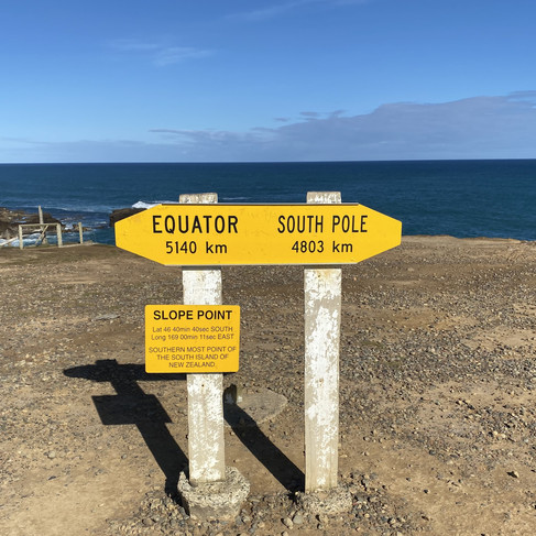 Na wat iets meer dan alleen een koffiestop werd, gingen we door. Er stonden nog watervallen en "het einde van NZ" op de planning. Er zijn best wel wat watervallen in de omgeving hier, maar de McLean Falls zijn (volgens mij) de grootste. Het is zo'n 20 minuten lopen door een oerbos om hier te komen. Kleine moeite, veel plezier :). Maar ook hier moesten we weer snel door om naar de volgende en laatste stop te gaan: Slope Point. Dit is het zuidelijkste puntje van het Zuidereiland. Deze locatie is vooral leuk voor het idee dat je echt bijna op het "einde van de wereld" bent, maar het ligt gewoon in een weiland van een boer dus het is qua natuur en bezienswaardigheden wel ietsje minder spectaculair dan de andere stops.